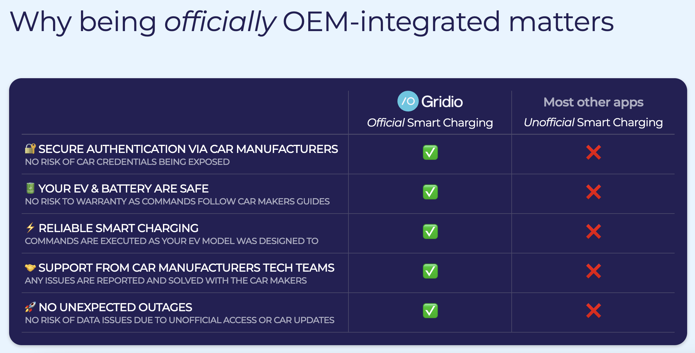 While Kia vehicles do not yet support remote smart charging control via commercial fleet APIs, access to high-quality, real-time vehicle data is a critical prerequisite for doing smart charging properly. By working directly with car manufacturers (OEMs), Gridio ensures that integrations are: